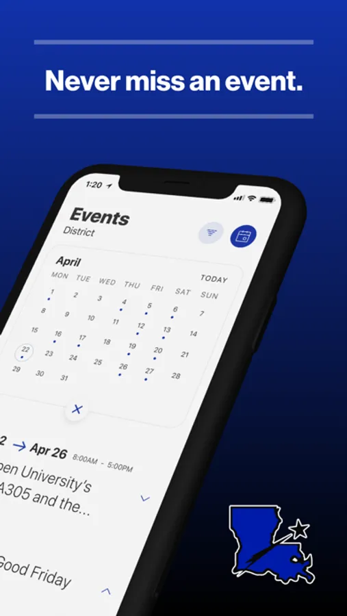 The event section shows a list of events throughout the district. Users can add an event to their calendar to share the event with friends and family with one tap.