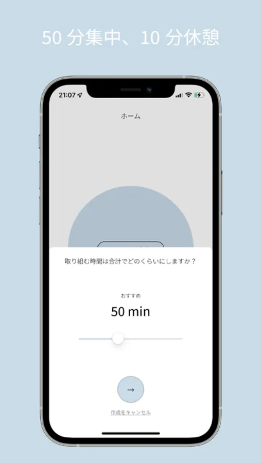 Focus Timerは、50分間の作業時間の後、10分間の休憩時間が自動的にスタートするタイマーになっています。