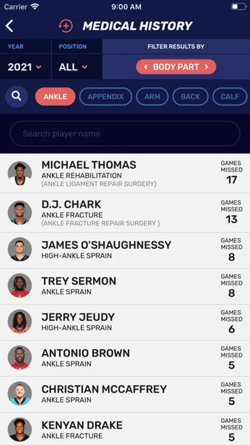 Mobile Database: Access a detailed injury history on hundreds of players stretching back 10+ NFL seasons. Mine data to better understand league-wide injury trends by position, by body part, by type and severity.