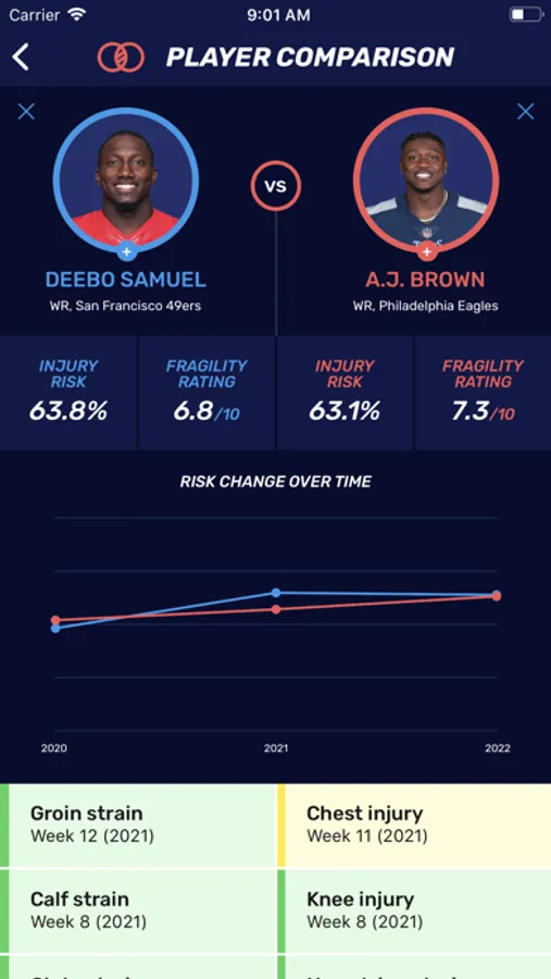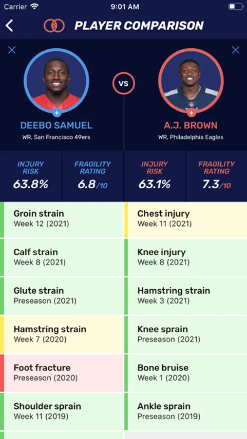 Fragility Comparison Center: Challenge injury prone narratives with Injury Finder’s interactive player comparison tool, which compares injury histories, fragility ratings, and injury probabilities back through time.
