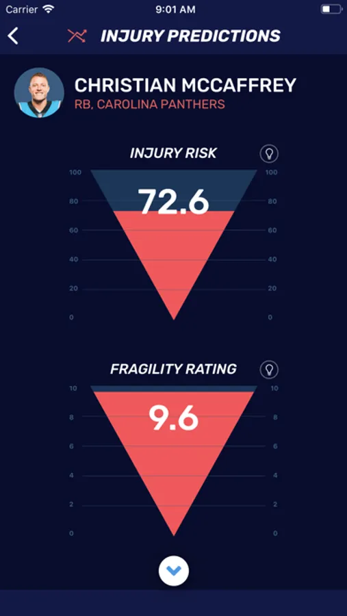 Injury Predictions (In-app Purchase): Why is Christian McCaffrey more likely to miss games than other NFL skill position players? Using a player’s physical attributes, projected usage and injury history, Injury Finder determines the chances that a player misses multiple games or is injured on any given dropback, carry or reception.