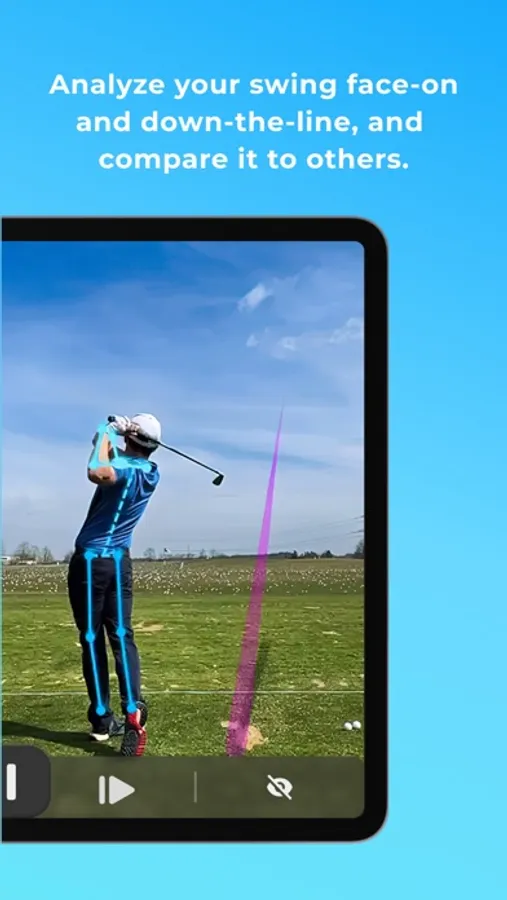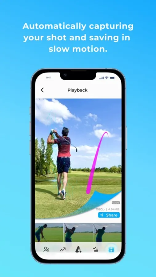 Get detailed results of your shot, including shot shape as well as insights of hit point, swing plane and accuracy over the launch monitor. Keep track of your previous shots and see improvements based on quantitative metrics. All swings and results are automatically logged and always available over the stats screens. See instant replays of your swings in slow motion after every single shot – don’t miss any good shot anymore! Share your swing video or screenshots with stats overlays over social media directly from the app.