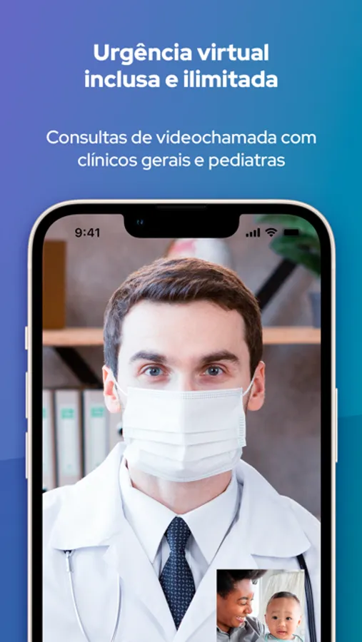 - Acesso a consultas gratuitas por video chamada com um médico adulto e pediátrico;