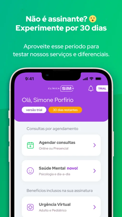 Caso você não seja assinante do plano Clínica SiM+, você pode testar alguns dos benefícios do App por um período de 30 dias, sem compromisso ;)