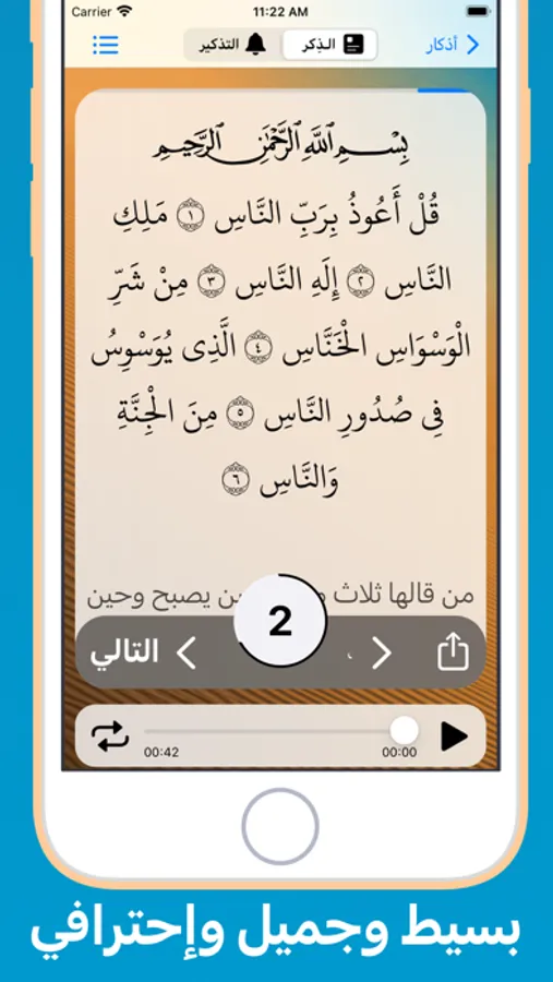 - يمكنك التحكم بالتذكيرات والاشعارات كاملًا في التطبيق واختيار الوقت وصوت التذكير لاي ذِكر او دعاء او تسبيح او اي قسم ..