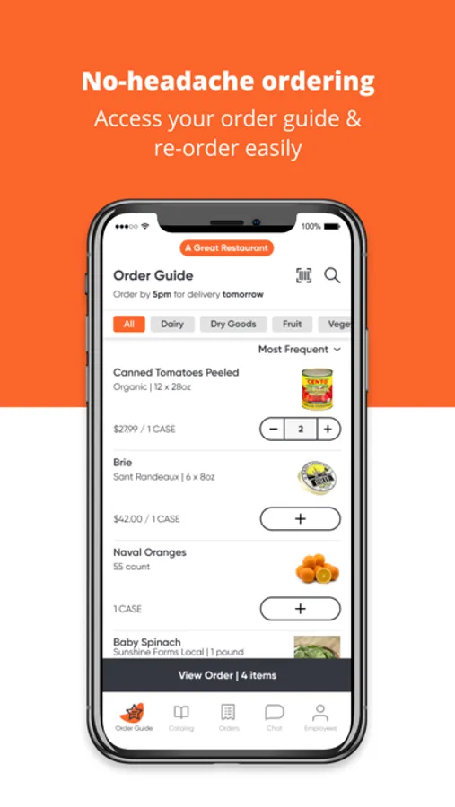 Our mobile app lets you search our complete product catalog, manage and update your ordering guide, and buy what you need at the moment you need it. It’s part of our commitment to giving you an ordering experience you’ll love.