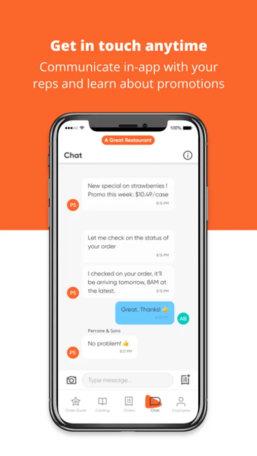 - Get in touch anytime: communicate directly with your Perrone & Sons rep in the app