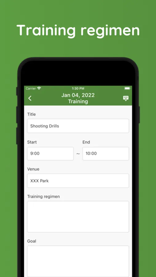 You can register your training regimen, date, time, location, and goals. A photo can also be registered.