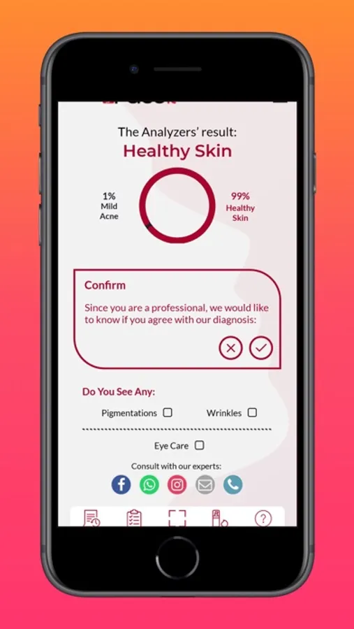 To resolve facial skin conditions ( Acne, dryness, pigmentation, wrinkles etc. ) you first need a professional cosmetician to have a look. Now you can simply get immediate results by taking a photo and at the press of a button you get a reliable assessment of the skin condition instantly by software designed with the know-how of experts.