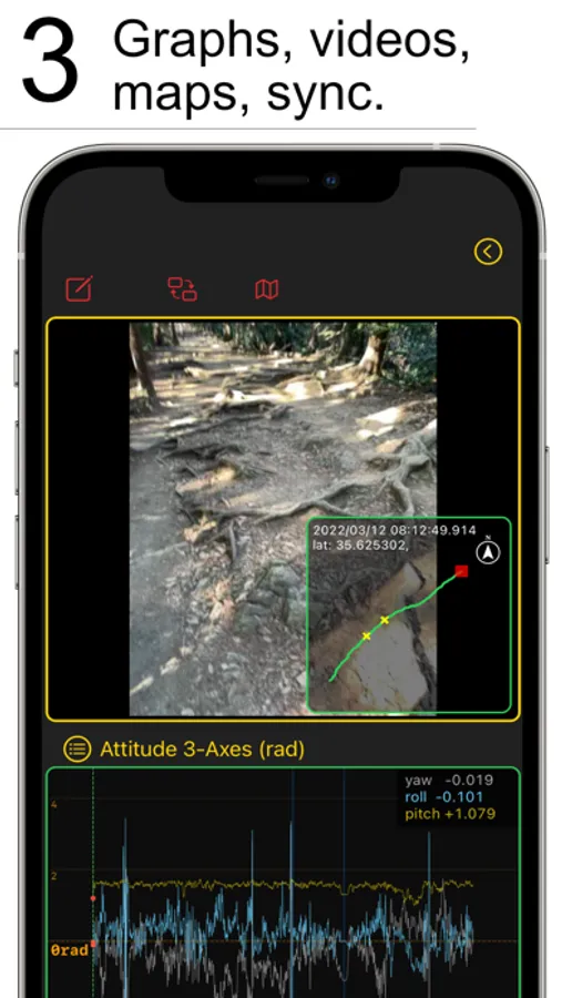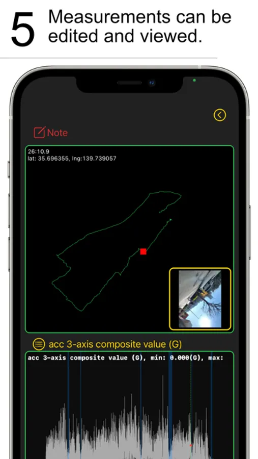 Position information, each sensor value (graph), and video data can be confirmed synchronously (Verify the slider or press the play button). If you shoot a photo, you will receive a photo when you reach the photo taken.