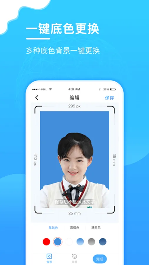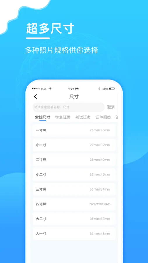 证件照,几百种证件照规格尺寸,满足你证件照的使用场景需求:考驾照、普通话测试、教师资格证、会计考试、护士资格证、公务员考试、四六级考试、留学出国、雅思托福报名,宝宝证件照、微商、签证等各种需求一键满足。更多多种背景色可选,还能一键P图轻松换底,便捷省力。