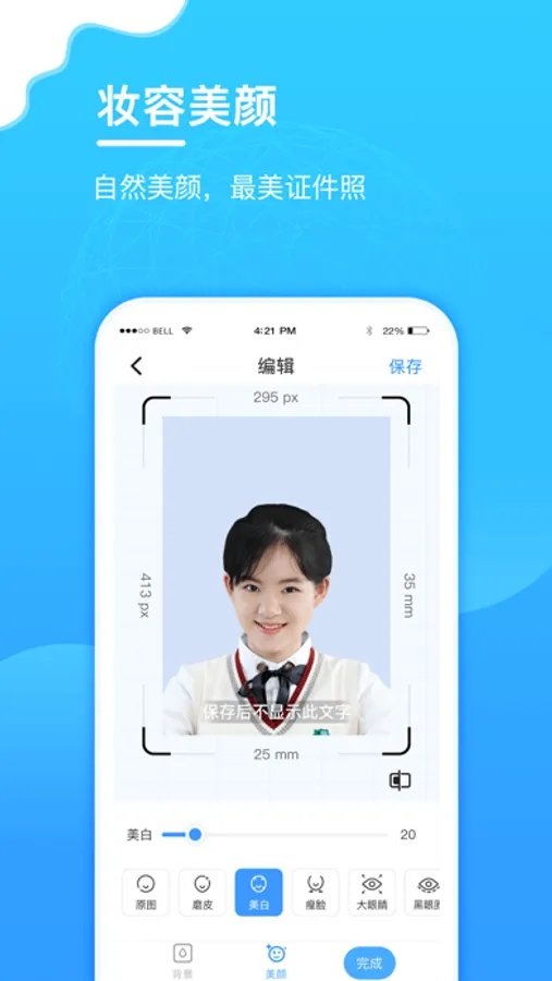 证件照在你工作繁忙,求职心切、在你孩子上学需要一张报名证件照、在你军训劳累没空化妆不想排队、在你考试报名急要证件照、在你证件照审核不通过……打开手机,只需一分钟,即可即刻拥有完美的证件照。多种ins滤镜、智能抠图、换脸奇效、精美正装、高清冲印无水印,打造ai网红效果,足不出户,包邮到家!