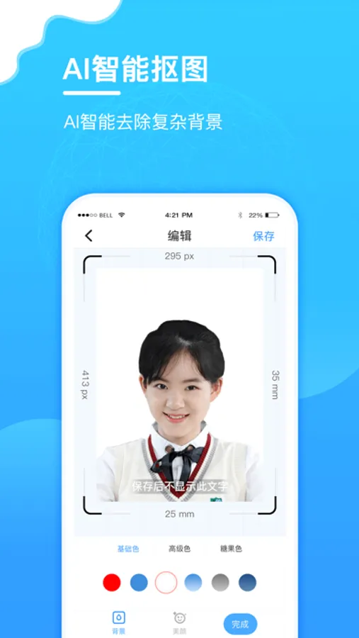 证件照,潜心研制核心科技,强大的AI智能抠图算法,完美呈像,无水印。让你的证件照轻松通过审核,提升面试face to face的印象。