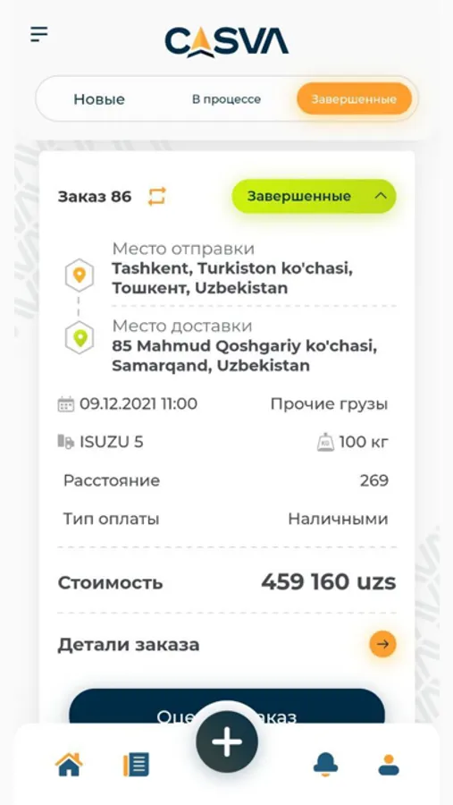 При помощи CASVA вы сможете за пару минут оформить заявку на перевозку как крупногабаритных, так и небольших посылок и отправлений. Наша система рассчитает сумму доставки с учетом деталей вашего заказа: его веса, габаритов, направления доставки, типа желаемого транспорта для перевозки.