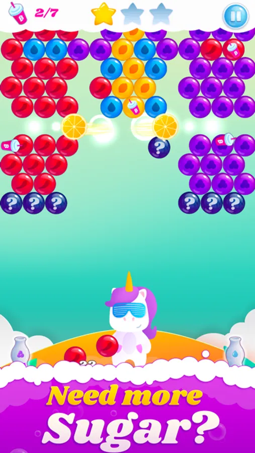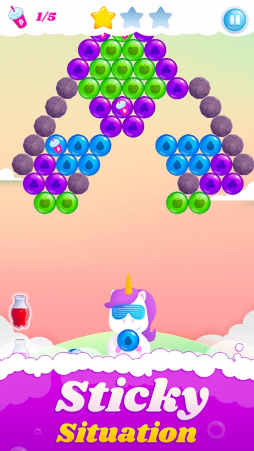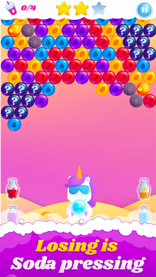 How to Play: Target a cluster of bubbles using the guiding dotted line with the objective of matching 3 or more like-colored bubbles. Shoot your shot—if you connect with like-colored bubbles they will pop! Collect the number of sodas required to complete the level. Note you only have a certain number of shots to complete the task. The fewer shots you take, the higher your score will be. Use your power-ups to help you progress when needed.