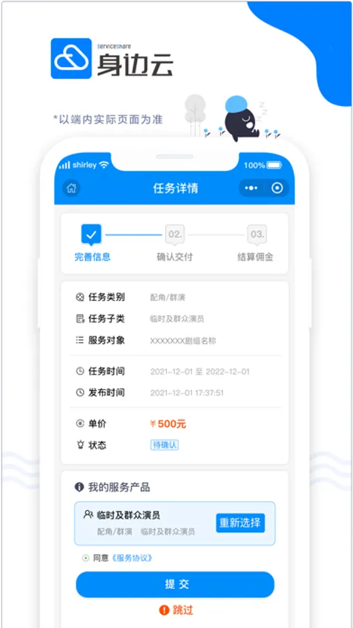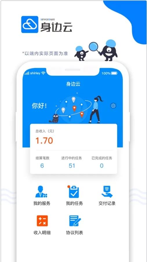 身边云定位于企业共享服务交易平台,致力帮助企业采用共享服务满足运营需求。平台通过技术手段将各类运营服务标准化、颗粒化,形成个人或小微团队以ServiceShare(自由职业者)的方式完成该项工作解构并满足共享服务的订单。整合共享服务商供应链及第三方应用,赋能企业采用共享服务产品变革运营组织方式,提升经营效益,构建企业共享服务开放平台。此APP为自由职业者门户。