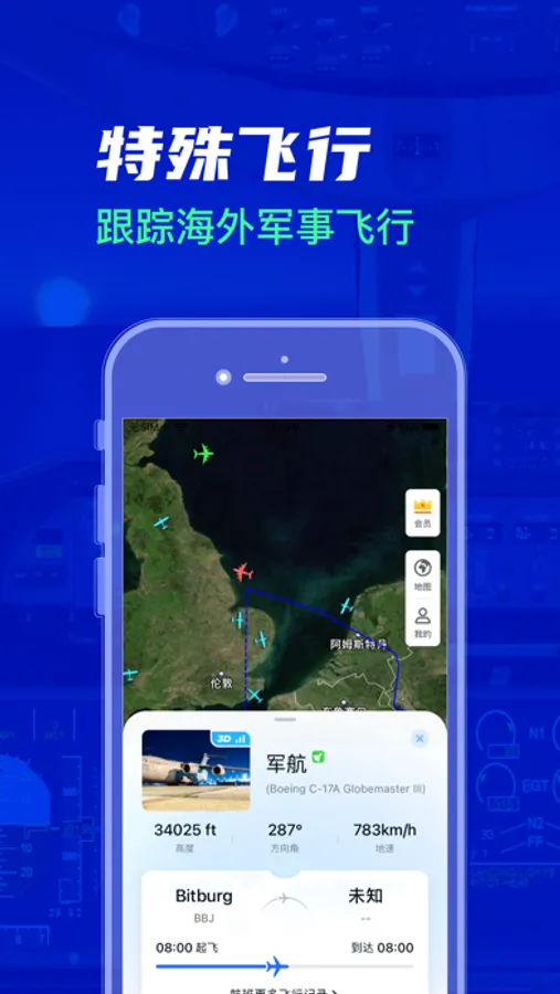 3. 飞机分类:民航、通航、军航分类显示,一秒找到你感兴趣的航班;