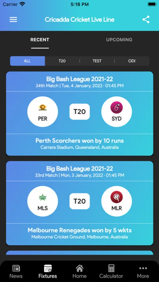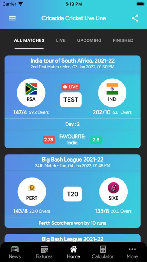 - Categorized match schedule (International, ODI, Test, T20, Leagues, Women).
