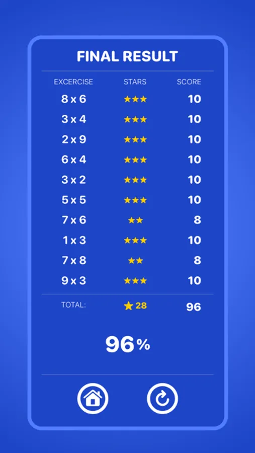 It tests speed and knowledge at the same time. For a perfect result, you need to know the multiplication table perfectly and confidently.