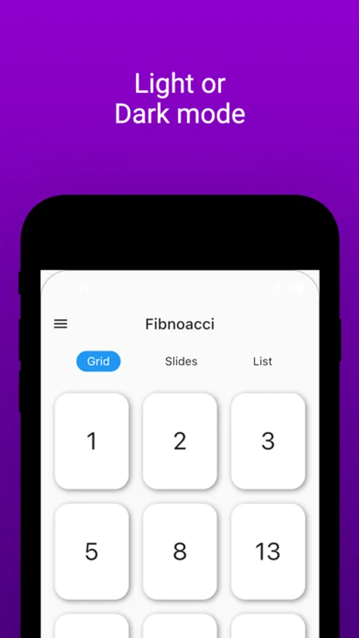 The Ui includes a beautiful dark mode as well as different typs for chosing a card (grid, list, slides).