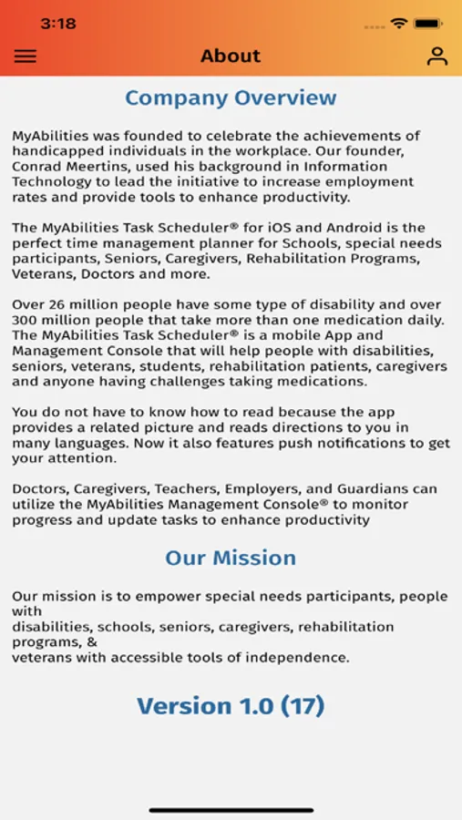 MyAbilities Task Scheduler helps if you are Special Needs, Autism, Seniors, Veterans, Disabilities. It enables and improves the independence of participant’s lifestyles by allowing you to take live pictures of a task and add text to speech. This can also be used as a medication reminder for anyone that takes a lot of medication. Most of the data are stored on your local device whereas to maximize performance some data are stored in the cloud.