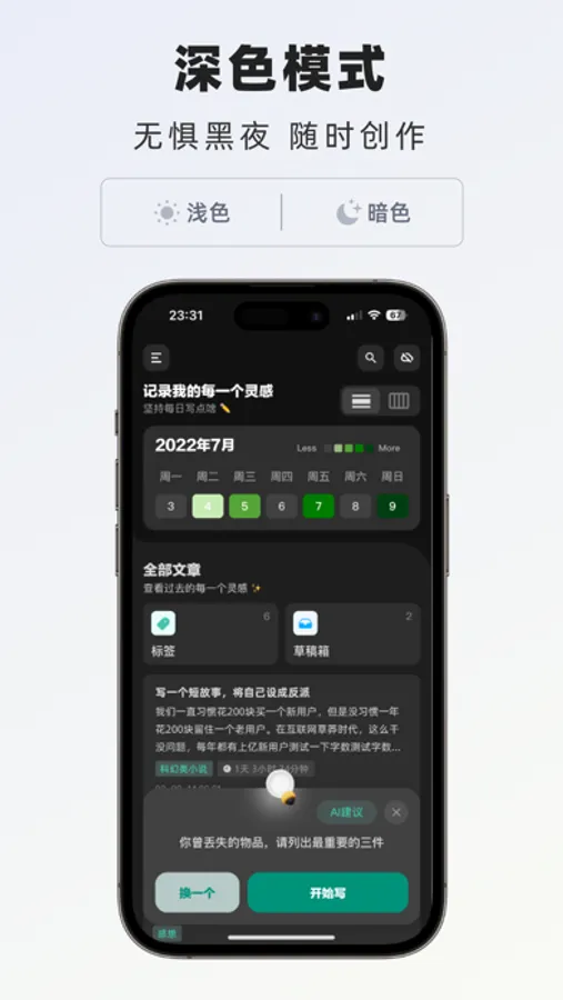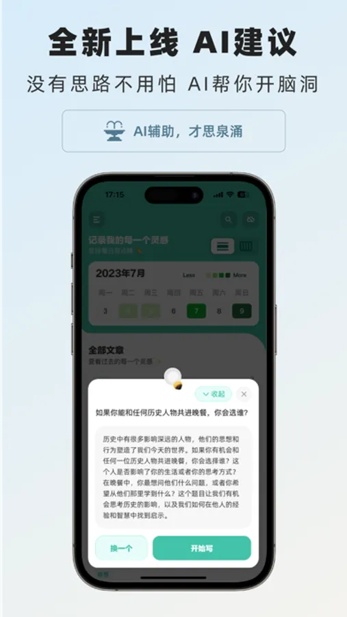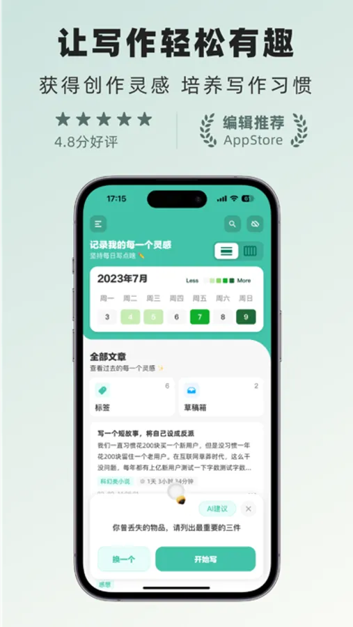「写点啥」拥有上千个有趣的题目,覆盖各种类型,包括关于自我、生活、想象等。同时,我们的AI题目建议功能也能在您需要时提供灵感。