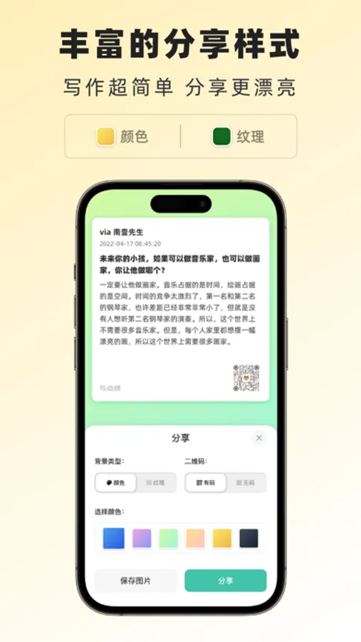 「写点啥」是一款专为打破写作壁垒,让写作变得轻松有趣的应用。我们的目标是帮助您突破写作瓶颈,练习不同的文字风格,以及培养持续的写作习惯。我们提供了丰富的功能来满足您多样化的写作需求。