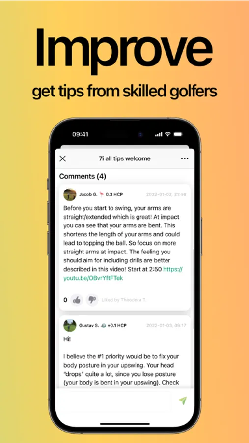 Record your golf swings, upload it to the public feed and get tips from other golfers using the app. Our community of golfers include trained PGA professionals and highly experienced amateurs. You can check the handicap and profile of users giving you tips as well as previous tips they have given to golfers and how well received these tips have been.