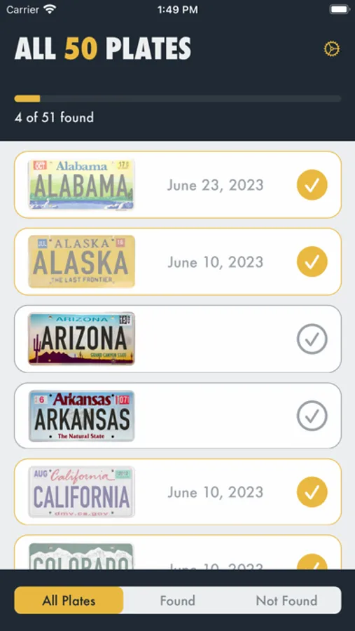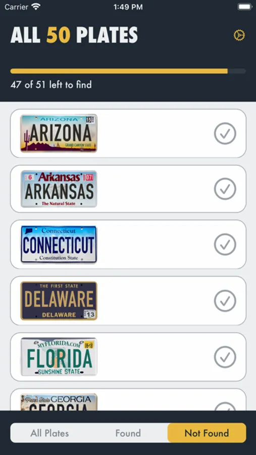 Bored on a long car ride? Find license plates from all 50 states (and the District of Columbia)! Use the app to keep track of all the license plates as you find them. Mark them off and even hide the one you found. Easily reset the game for every trip.