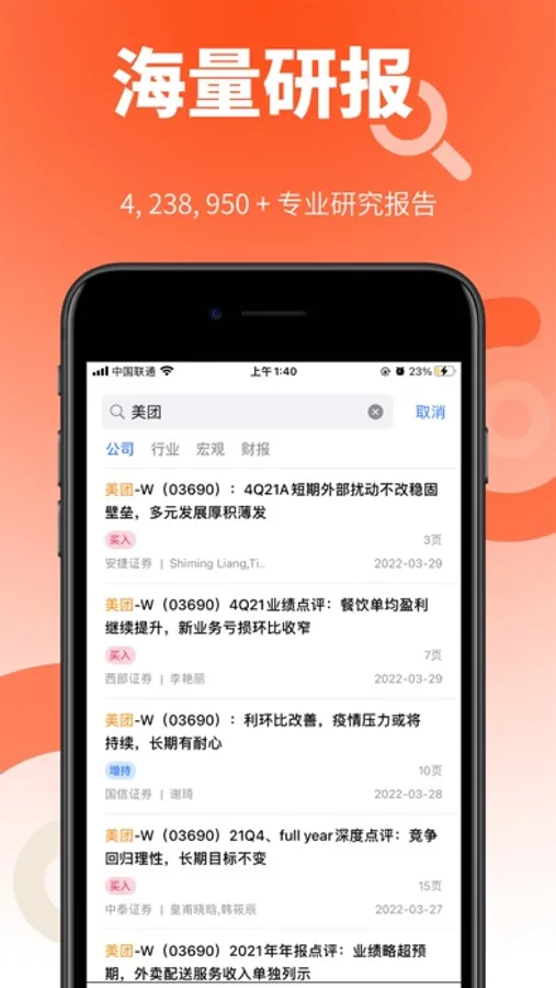 公司研究、行业报告、宏观策略、晨会早报、基金债券、财务报表、机构调研、公告资讯,覆盖 A 股 5000+ 上市公司,港美股 2600+ 上市公司,研报阅读必备工具。