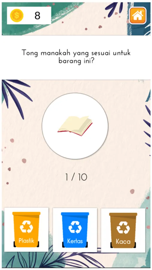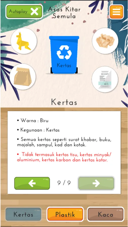 Terdapat tong sampah plastik, kaca dan kertas.