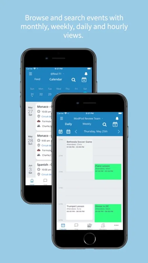 Group Calendar. ModPod’s group calendar is absolutely beautiful. It features multiple features to make planning an event, whether it’s a family dinner, a volunteer event or a greek social, super easy. The calendar features scrollable monthly views, a weekly view with more details, a daily “snapshot view” to show you everything happening right now (even the weather forecast!), and an hourly view that shows each pod member’s calendar side by side and color coded. Additional unique features for events are the ability to search locations (e.g., enter a restaurant, airport or soccer field name), and ModPod automatically shows you the matching location(s).