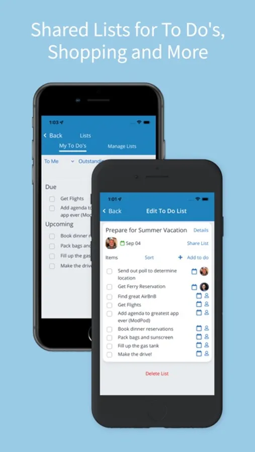 In Family mode, you can see everyone’s activities at a glance on the app home page. It’s designed for busy families that need to track and manage numerous activities on a daily basis. Think of a busy family where kids have music lessons, after school activities, and sports practices. ModPod organizes all these activities, sends out reminders, provides driving directions and more. ModPod is also great for planning family vacations and outings, as you can track hotel or AirBnB reservations and create multi-day agendas.