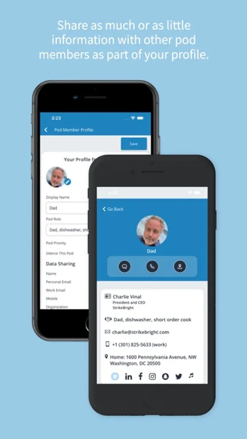 Member Profiles. ModPod users get to choose what information is shared with each pod. Your information is entered once in your main profile, then you simply choose what to share with each pod. So maybe all your contact info is in your family pod, but only a display name is shared with your fan group. Optional information includes your mobile phone, work phone, address, work address, job title and all of your social media handles, including Facebook, Instagram, Snapchat, Linkedin, Twitter, TikTok, personal URL and Venmo.