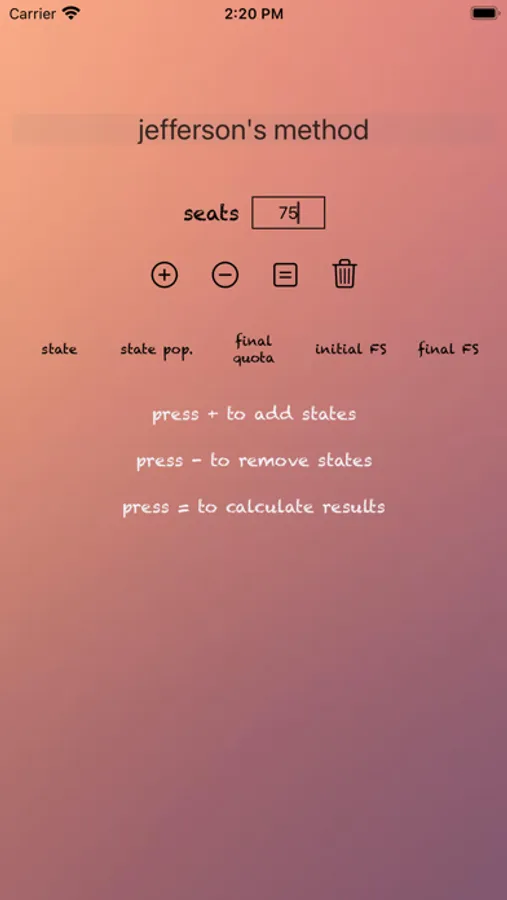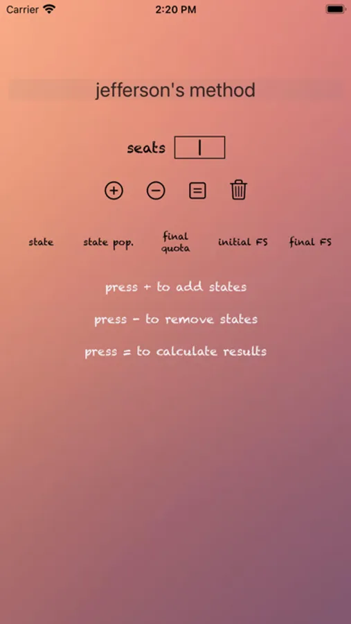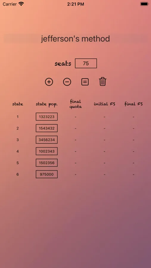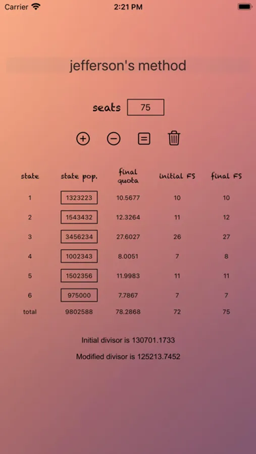 This app uses Jefferson's method of apportionment to apportion a user-specified amount of seats to categories (called states) based on each category's value (the population size).