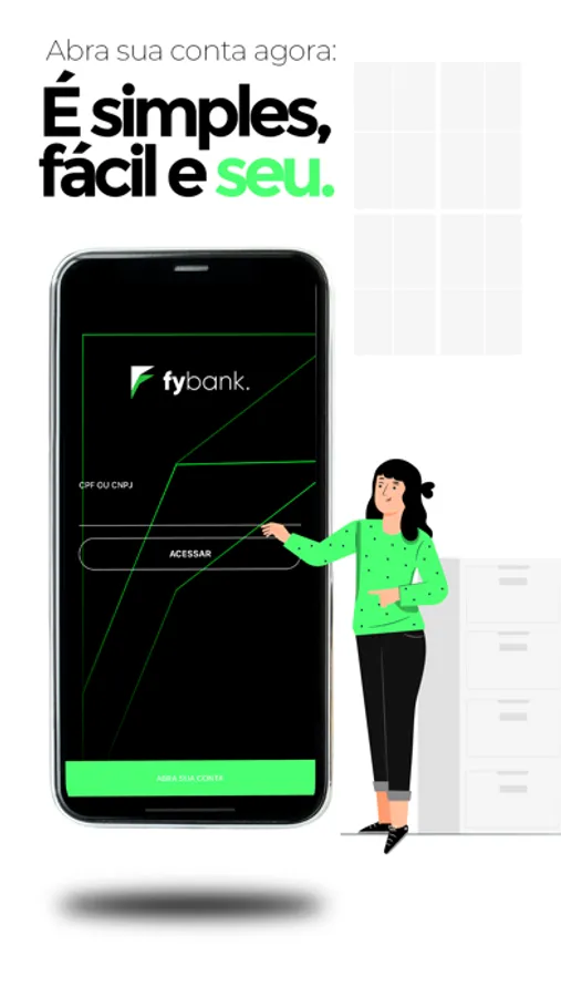 "Abra sua conta digital no FyBank. Evoluímos cada vez mais para que você tenha a melhor experiência, O FyBank oferece uma conta corrente completa e totalmente gratuita!