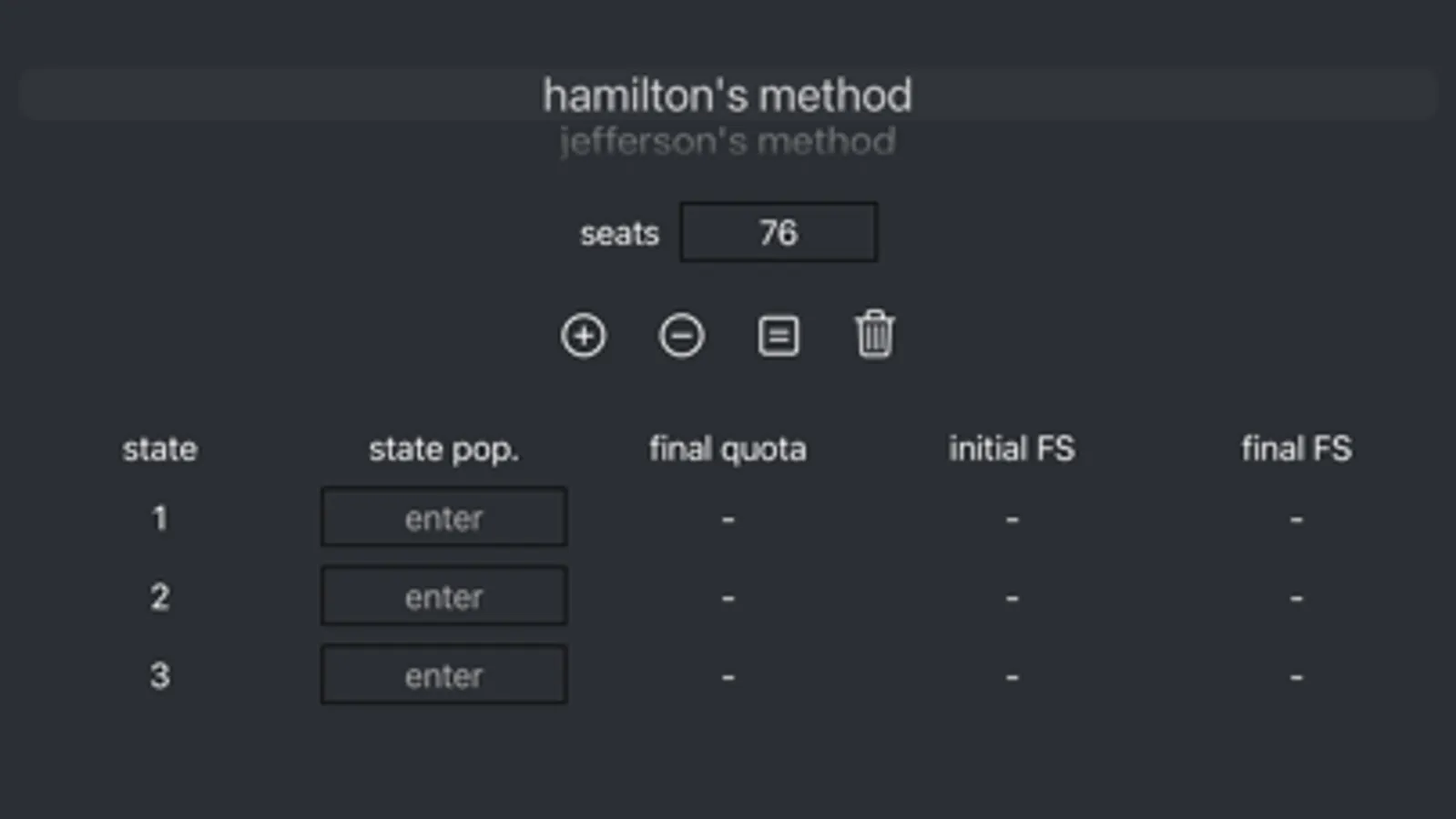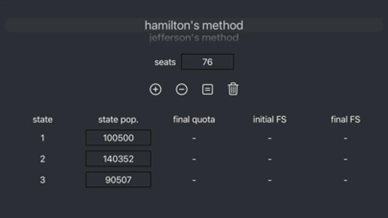 This app uses Hamilton's, Jefferson's, Adam's, and Webster's methods of apportionment to apportion a user-specified amount of seats to categories (called states) based on each category's value (the population size).