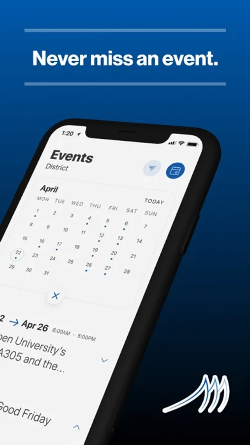 The event section shows a list of events throughout the district. Users can add an event to their calendar to share the event with friends and family with one tap.