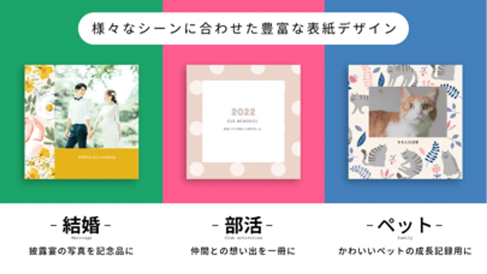 ・フォトブックの表紙デザインが豊富なフォトブック作成アプリを探している