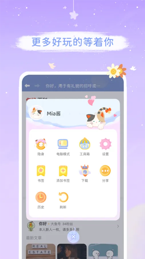Mia浏览器是一款以Mia为IP形象以及可爱的插画风格为主,专注于年轻人的浏览器。