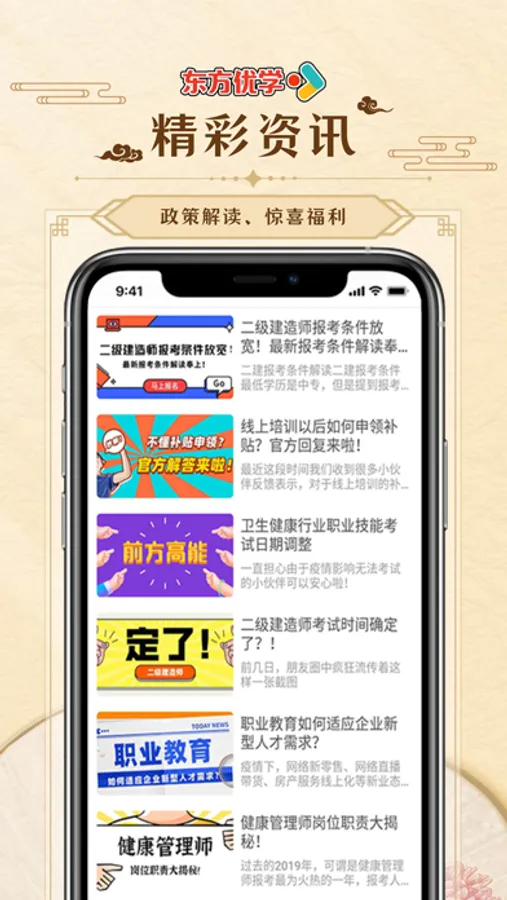 东方优学APP是由东方优学(深圳)教育咨询有限公司开发并提供服务支持的教育培训平台,通过在线学习平台,整合录播、题库、测评、双师等多种学习方式,全方位满足学习者的学习、训练和实操需求。拥有国内外领先的教研、技术和服务团队,在职业培训领域始终保持探索创新,力求向用户提供更加完善的服务。