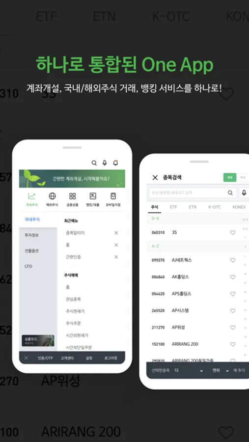 하나의 앱으로 계좌개설 및 청약, 국내/해외주식, 선물옵션, 펀드거래 등이 가능하며