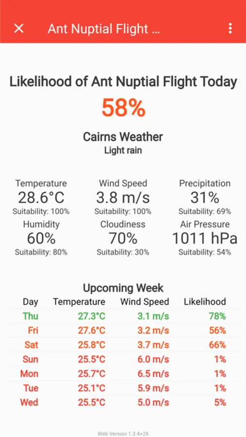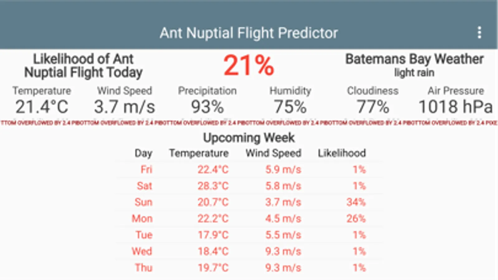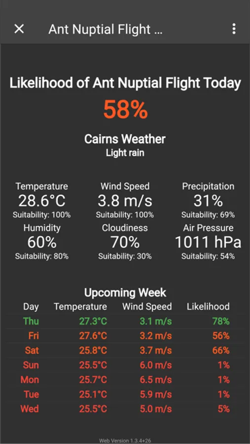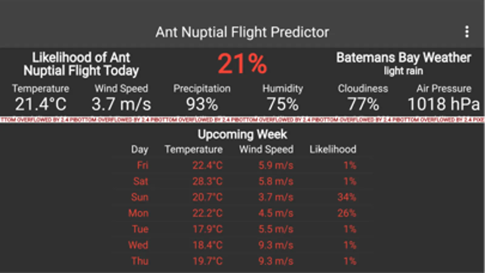 Ant Nuptial Flight Predictor downloads the weather in your current location and gives you the rough likelihood that queen ants are flying near you today and for the next week. When the percentage is high, time to get outside and looking for ants in your local area!