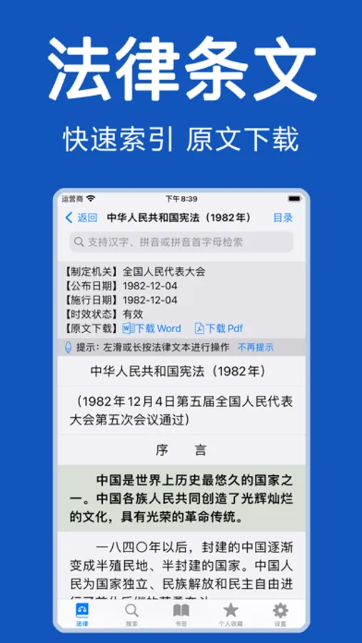 中国法律App是一部法律手册,每一位中国公民都应该有这样一部法律手册,用法律武装自己是法治社会每一个成年人必备的基本技能。