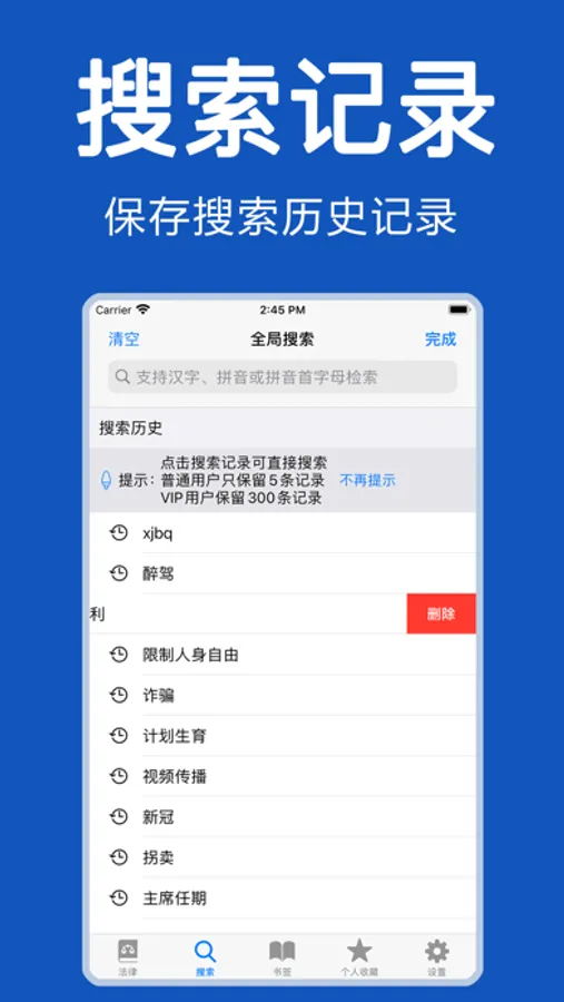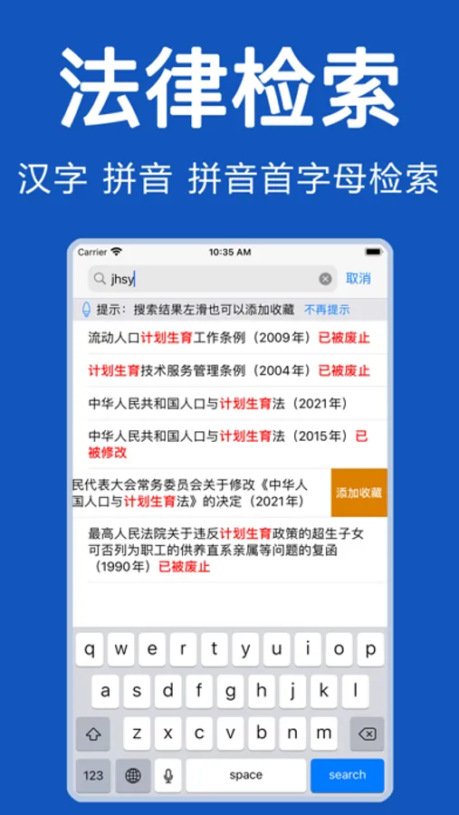 1. 支持汉字、拼音和拼音首字母检索,例如只需输入 mfd 就可以轻松检索到 民法典