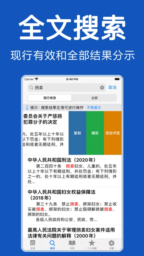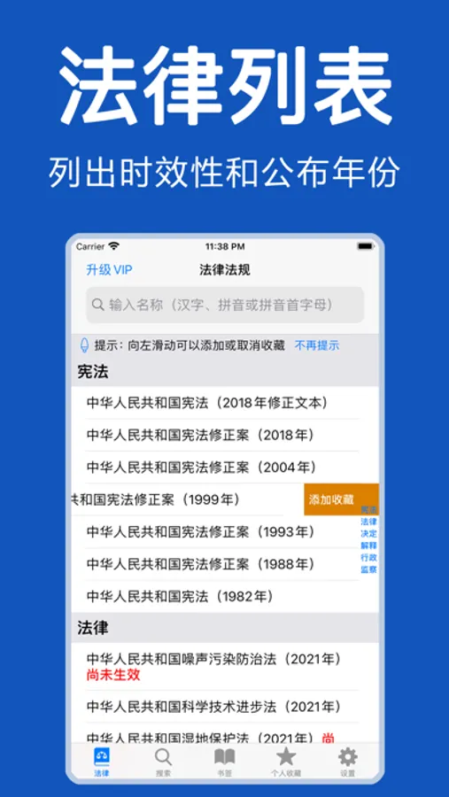 中国法律App包含中华人民共和国建国(1949年)以来所有历史版本的法律法规、司法解释以及相关决定,在标题中列出发布年份以及特殊时效性(尚未生效、已被修改、已被废止),例如:中华人民共和国国家金库条例(1985年)已被修改,中华人民共和国国家金库条例(2020年)。