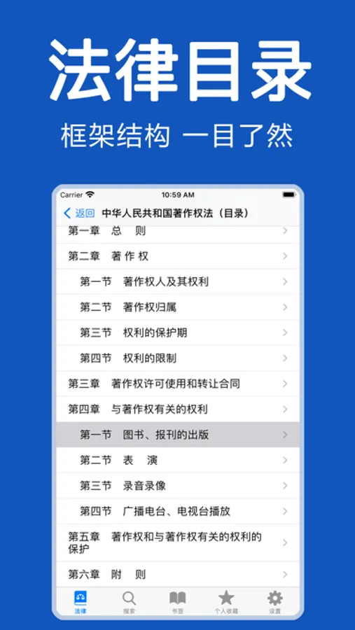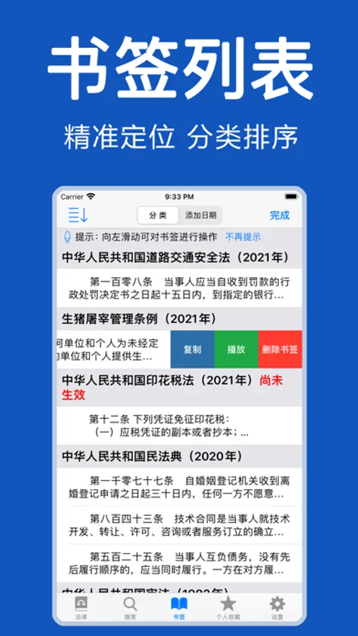 5. 支持书签功能,任意条文都可以添加书签,精确定位,书签可以按加入时间或分类展示和排序