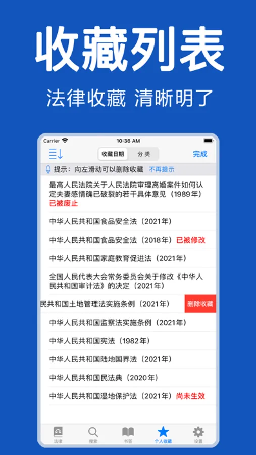 6. 支持法律收藏功能,收藏的法律法规可以按收藏时间或分类展示和排序