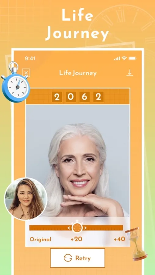 See the changes over a long period of time on your face. Use this aging effect and have a quick check of your future appearance after 30 years.