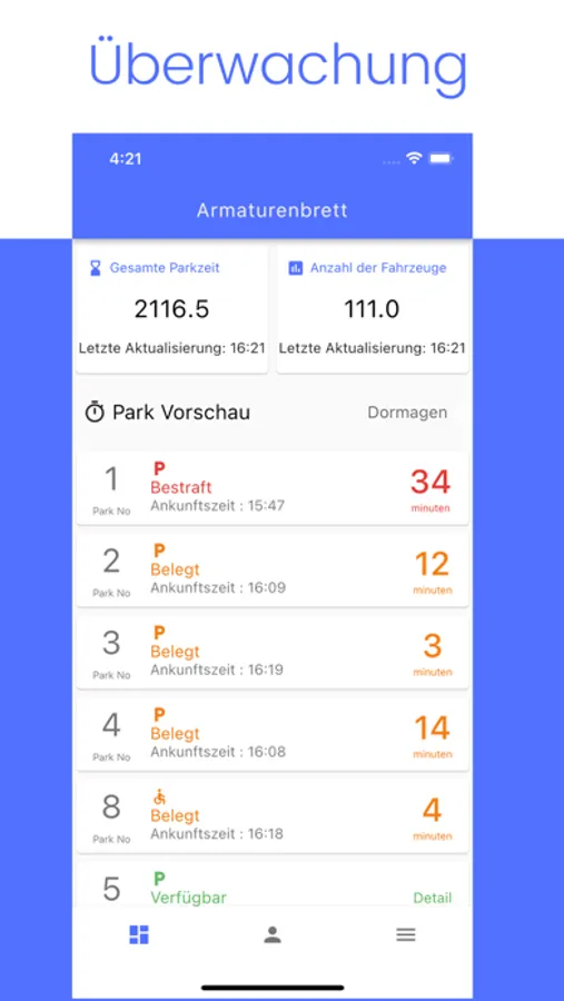 App benachrichtigt, wenn ein Autofahrer die Frist überschritten hat.Somit ist eine Erfolgsquote der identifizierten Falschparkern von 99% garantiert.Das Personal der Parkraumüberwachung leistet somit eine viel effizientere Personal Performanz.Vorteile : Der Eigentümer der Parkplätze wird sofort benachrichtigt wenn ein Fahrzeug die Höchstparkdauer überschreitet. Somit ist es dem Personal der Parkraumüberwachung möglich Falschparker über das Handy ausfindig zu machen. Dem Personal der Parkraumüberwachung wird somit eine effizientere Personalperfomanz geboten und gleichzeitig wird ein höherer Umsatz erzielt.